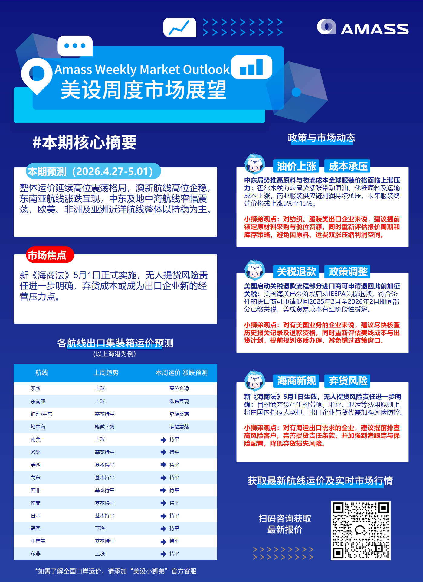 【美设周度市场展望】本周运价预测:澳新高位企稳,多航线平稳运行 | 260427
